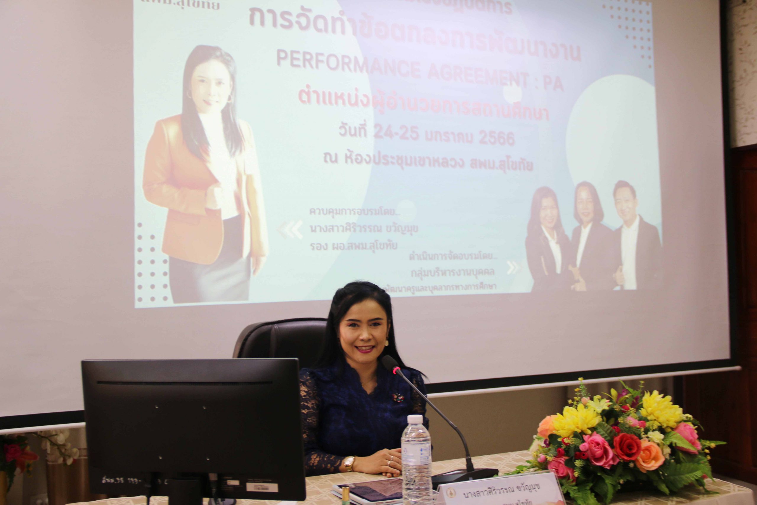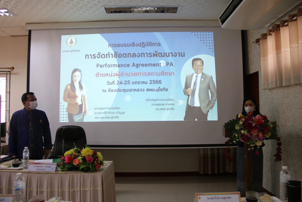 นายสุดเขต สวยสม ผู้อำนวยการสำนักงานเขตพื้นที่การศึกษามัธยมศึกษาสุโขทัย เป็นประธานการอบรมเชิงปฏิบัติการ การจัดทำข้อตกลงการพัฒนางาน Performance Agreement : PA ตำแหน่งผู้อำนวยการสถานศึกษา โดยมี นางสาวศิริวรรณ ขวัญมุข รองผู้อำนวยการสำนักงานเขตพื้นที่การศึกษามัธยมศึกษาสุโขทัย พร้อมด้วย กลุ่มนิเทศ ติดตามและประเมินผล การจัดการศึกษา คณะผู้อำนวยการสถานศึกษาในสังกัด และบุคลากรที่เกี่ยวข้องเข้าร่วมการอบรมฯ ระหว่างวันที่ 24-25 มกราคม 2565 ณ ห้องประชุมเขาหลวง สำนักงานเขตพื้นที่การศึกษามัธยมศึกษาสุโขทัย (วันที่ 24 มกราคม 2566)