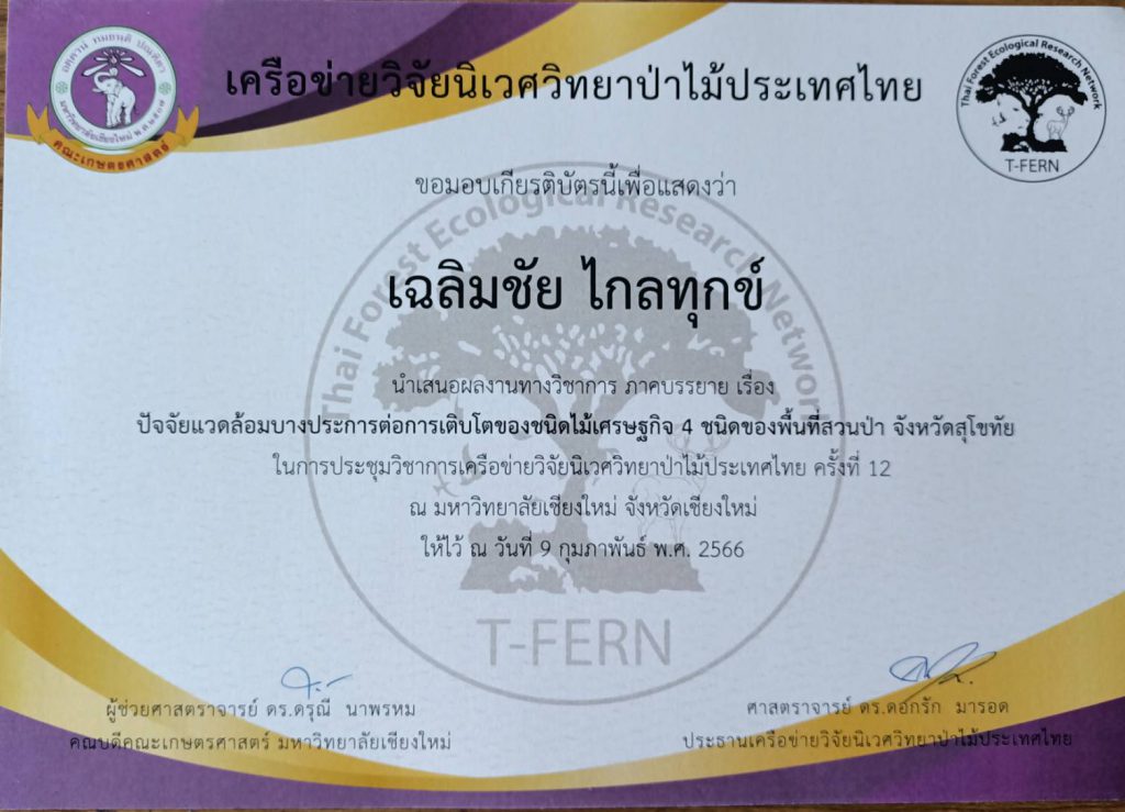 นายเฉลิมชัย ไกลทุกข์ ครูโรงเรียนกงไกรลาศวิทยา ได้รับคัดเลือกผลงานทางวิชาการ ตีพิมพ์ ในวารสารวิจัยนิเวศวิทยาป่าไม้เมืองไทย (TCI 1) จากการนำเสนอผลงานทางวิชาการ ภาคบรรยาย เรื่อง “ปัจจัยแวดล้อมบางประการ ต่อการเติบโตของชนิดไม้เศรษฐกิจ 4 ชนิดของพื้นที่สวนป่า จังหวัดสุโขทัย” ในการประชุมวิชาการเครือข่ายวิจัยนิเวศวิทยาป่าไม้ ประเทศไทย ครั้งที่ 12 ณ มหาวิทยาลัยเชียงใหม่ จังหวัดเชียงใหม่ (วันที่ 9 กุมภาพันธ์ 2566)