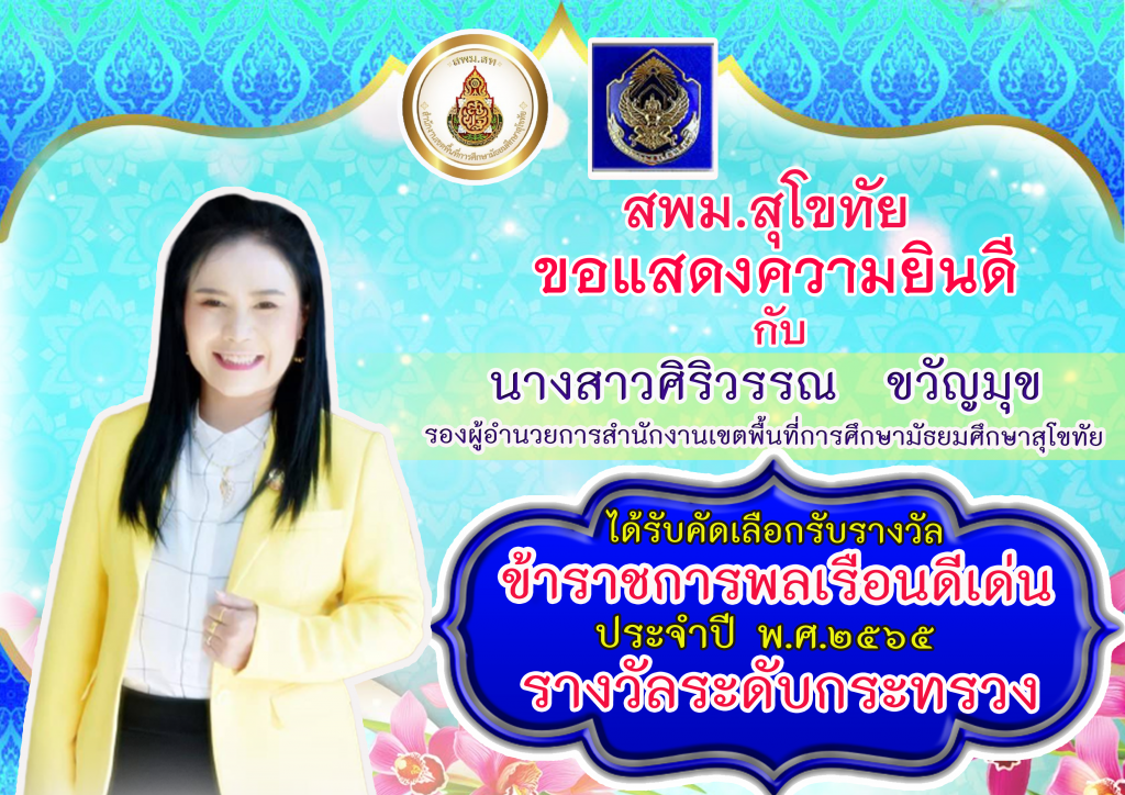 สพม.สุโขทัย ขอแสดงความยินดีกับนางสาวศิริวรรณ ขวัญมุข รอง ผอ.สพม.สุโขทัย 29 มีนาคม 256629 มีนาคม 2023 ธีรโชติ พระเจริญ ข่าวกิจกรรม สพม.สุโขทัย ขอแสดงความยินดีกับนางสาวศิริวรรณ ขวัญมุข รอง ผอ.สพม.สุโขทัย ได้รับคัดเลือกรับรางวัลข้าราชการพลเรือนดีเด่น ประจำปี พ.ศ.2565 รางวัลระดับกระทรวง เยี่ยมชม : 1,178 ธีรโชติ พระเจริญ