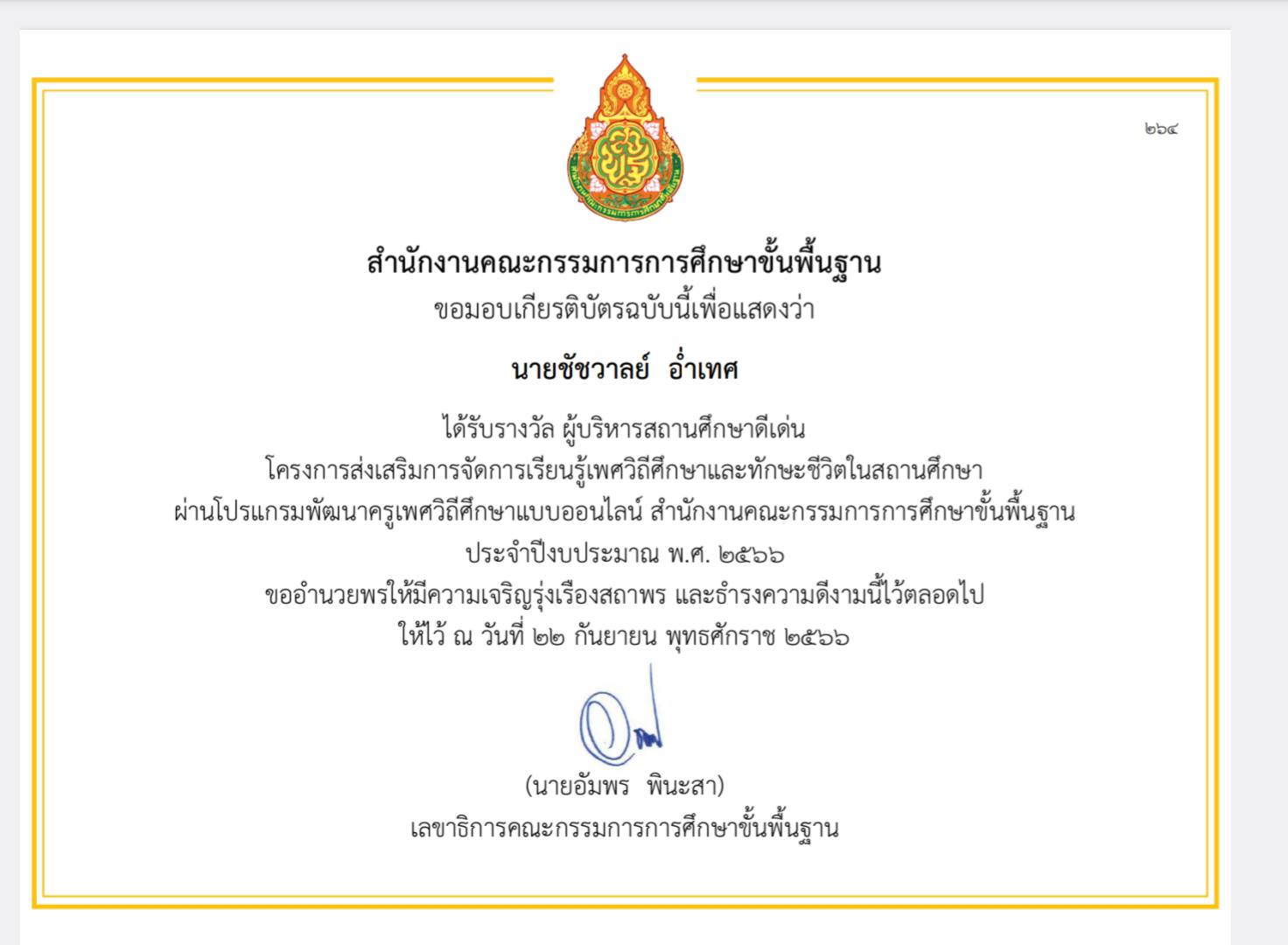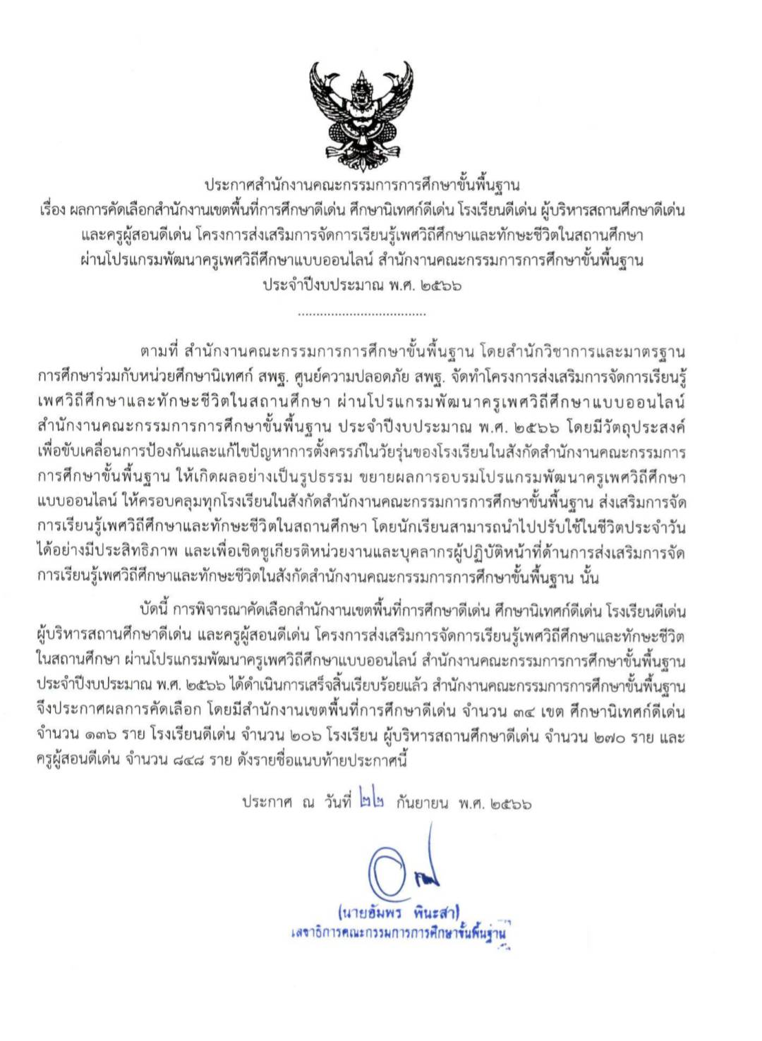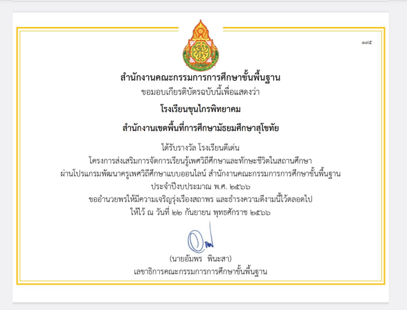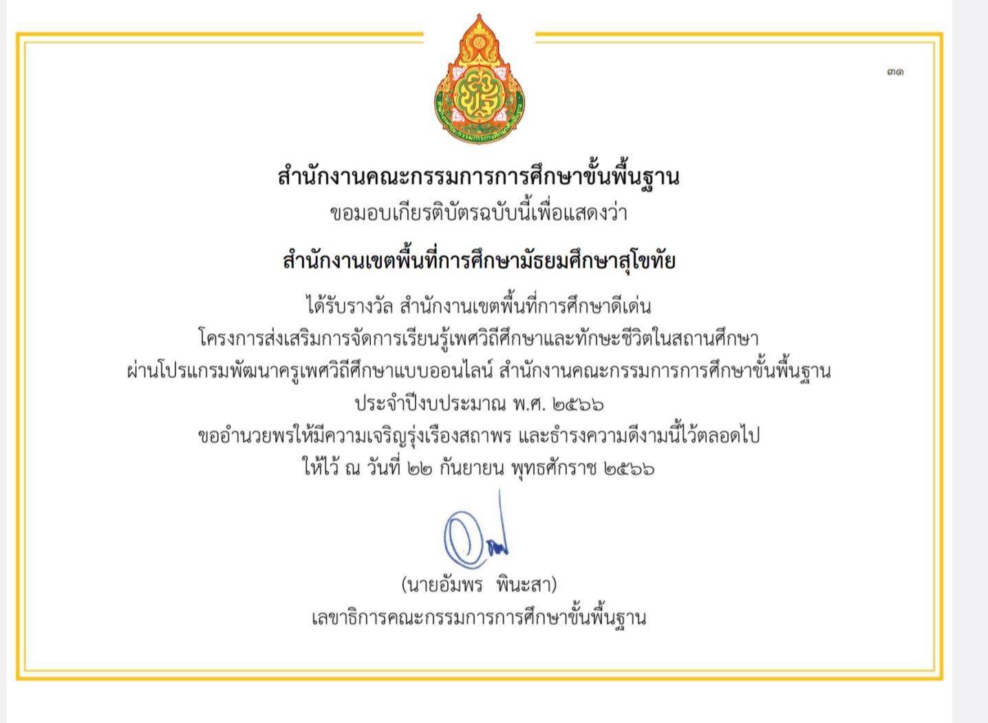 ประกาศผลการคัดเลือกโครงการส่งเสริมการจัดการเรียนรู้เพศวิถีศึกษา และทักษะชีวิตในสถานศึกษา ผ่านโปรแกรมพัฒนาครู เพศวิถีศึกษาแบบออนไลน์ สำนักงานเขตพื้นที่การศึกษาขั้นพื้นฐาน ประจำปีงบประมาณ 2566 โดยมีสำนักงานเขตพื้นที่การศึกษา มัธยมศึกษาสุโขทัย ได้รับการคัดเลือกฯ ได้แก่ 1. สำนักงานเขตพื้นที่การศึกษามัธยมศึกษาสุโขทัย ได้รับรางวัล สำนักงานเขตพื้นที่การศึกษาดีเด่น 2. นางสาวเผอิญ วงษ์ทับทิม ผอ.กลุ่มนิเทศ ติดตามและประเมินผล ได้รับรางวัล ศึกษานิเทศก์ดีเด่น 3. โรงเรียนขุนไกรพิทยาคม ได้รับรางวัล โรงเรียนดีเด่น 4. นายชัชวาลย์ อ่ำเทศ ผู้อำนวยการโรงเรียนคีรีมาศพิทยาคม ได้รับรางวัล ผู้บริหารสถานศึกษาดีเด่น 5. นายวุฒิชาติ ชาติวุฒิ ผู้อำนวยการโรงเรียนขุนไกรพิทยาคม ได้รับรางวัล ผู้บริหารสถานศึกษาดีเด่น 6. นางสาวสุพินณา ตระกูลทิพย์ ครูโรงเรียนศรีนคร ได้รับรางวัล ครูผู้สอนดีเด่น และ 7. นางสาวขนิษฐา มาทุ่ง ครูโรงเรียนขุนไกรพิทยาคม ได้รับรางวัล ครูผู้สอนดีเด่น (วันที่ 22 กันยายน 2566)
