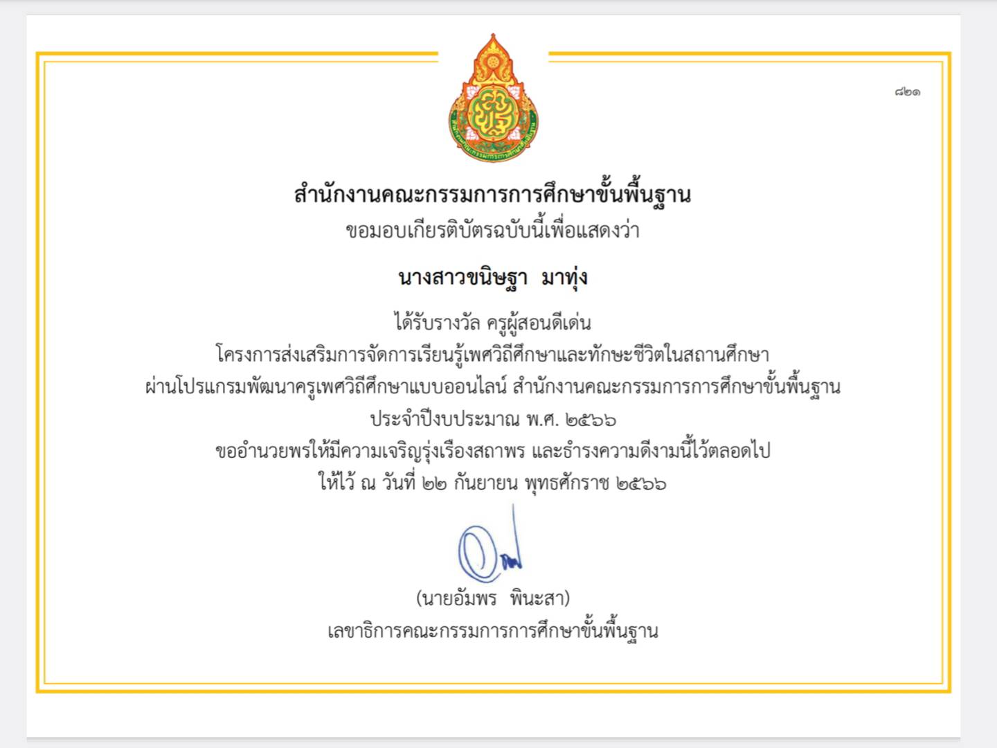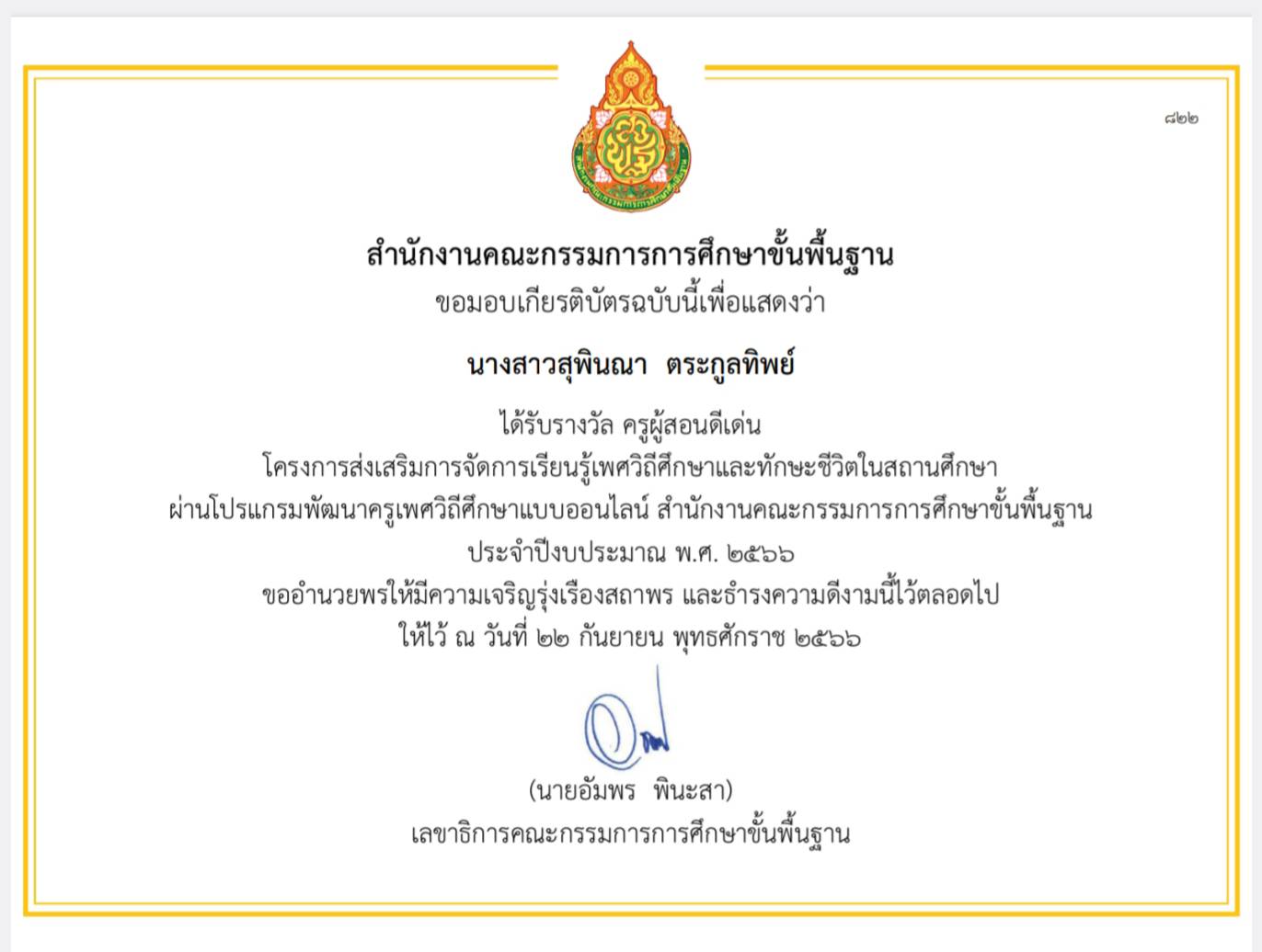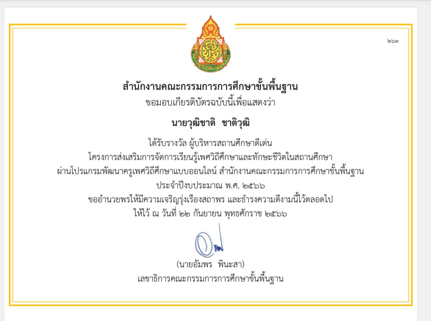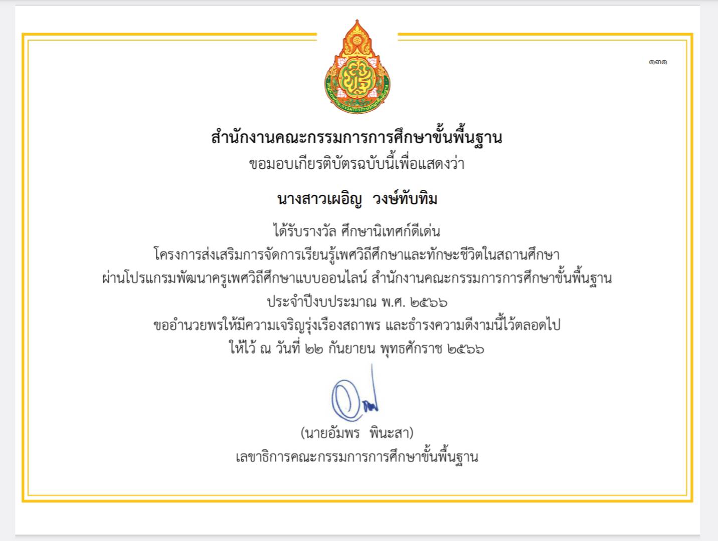 ประกาศผลการคัดเลือกโครงการส่งเสริมการจัดการเรียนรู้เพศวิถีศึกษา และทักษะชีวิตในสถานศึกษา ผ่านโปรแกรมพัฒนาครู เพศวิถีศึกษาแบบออนไลน์ สำนักงานเขตพื้นที่การศึกษาขั้นพื้นฐาน ประจำปีงบประมาณ 2566 โดยมีสำนักงานเขตพื้นที่การศึกษา มัธยมศึกษาสุโขทัย ได้รับการคัดเลือกฯ ได้แก่ 1. สำนักงานเขตพื้นที่การศึกษามัธยมศึกษาสุโขทัย ได้รับรางวัล สำนักงานเขตพื้นที่การศึกษาดีเด่น 2. นางสาวเผอิญ วงษ์ทับทิม ผอ.กลุ่มนิเทศ ติดตามและประเมินผล ได้รับรางวัล ศึกษานิเทศก์ดีเด่น 3. โรงเรียนขุนไกรพิทยาคม ได้รับรางวัล โรงเรียนดีเด่น 4. นายชัชวาลย์ อ่ำเทศ ผู้อำนวยการโรงเรียนคีรีมาศพิทยาคม ได้รับรางวัล ผู้บริหารสถานศึกษาดีเด่น 5. นายวุฒิชาติ ชาติวุฒิ ผู้อำนวยการโรงเรียนขุนไกรพิทยาคม ได้รับรางวัล ผู้บริหารสถานศึกษาดีเด่น 6. นางสาวสุพินณา ตระกูลทิพย์ ครูโรงเรียนศรีนคร ได้รับรางวัล ครูผู้สอนดีเด่น และ 7. นางสาวขนิษฐา มาทุ่ง ครูโรงเรียนขุนไกรพิทยาคม ได้รับรางวัล ครูผู้สอนดีเด่น (วันที่ 22 กันยายน 2566)