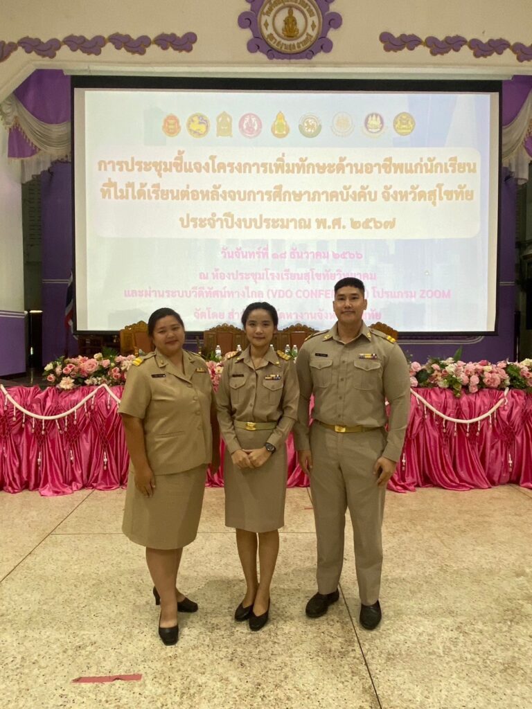 นายสุดเขต สวยสม ผู้อำนวยการสำนักงานเขตพื้นที่การศึกษามัธยมศึกษาสุโขทัย มอบหมายให้นายปวีณ ไชยวงค์วิลาน นักจิตวิทยาโรงเรียนประจำเขตพื้นที่การศึกษา เข้าร่วมประชุมสัมมนาเพื่อชี้แจงโครงการเพิ่มทักษะ ด้านอาชีพแก่นักเรียนที่ไม่ได้เรียนต่อหลังจบการศึกษาภาคบังคับ จังหวัดสุโขทัย ประจำปีงบประมาณ พ.ศ.2567  โดยมี นายสุชาติ ทีคะสุข ผู้ว่าราชการจังหวัดสุโขทัย เป็นประธานการประชุม เพื่อแจ้งแนวทางการขับเคลื่อนโครงการดังกล่าว โดยชี้แจงวัตถุประสงค์ ขั้นตอน ปฏิทิน การดำเนินโครงการฯ  ณ ห้องประชุมโรงเรียนสุโขทัยวิทยาคม ทั้งนี้ได้มีครูผู้รับผิดชอบ งานแนะแนวโรงเรียนในสังกัดเข้าร่วมประชุม โดยผ่านทางระบบวิดีทัศน์ทางไกล (VDO CONFERNCE) โปรแกรม ZOOM จัดโดยสำนักงานจัดหางานจังหวัดสุโขทัย (วันที่ 18 ธันวาคม 2566)