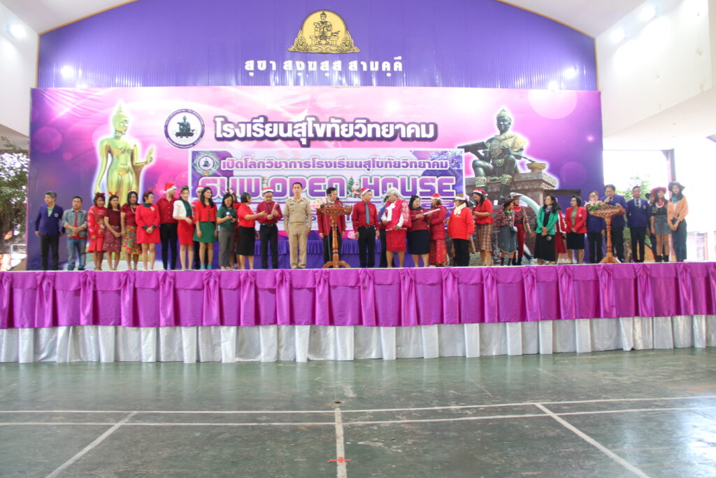 นายสุดเขต สวยสม ผู้อำนวยการสำนักงานเขตพื้นที่การศึกษามัธยมศึกษาสุโขทัย เป็นประธานในพิธีเปิดงาน “เปิดโลกวิชาการโรงเรียนสุโขทัยวิทยาคม (SUW Open House 2023)” ประจำปีการศึกษา 2566 พร้อมด้วย นายศราวุธ คำแก้ว นายวัลลภ เอี่ยมมะ รองผู้อำนวยการสำนักงานเขตพื้นที่การศึกษามัธยมศึกษาสุโขทัย ผู้อำนวยการกลุ่ม/หน่วย และศึกษานิเทศก์ เข้าร่วมพิธีฯ เพื่อให้ครูและนักเรียนได้นำเสนอผลผลิตตามกลุ่มสาระการเรียนรู้ สนับสนุนให้นักเรียน ได้แสดงออกซึ่งศักยภาพ ความสามารถในด้านวิชาการ ด้านดนตรี นาฎศิลป์ กีฬา ศิลปะการแสดง ทักษะวิชาชีพ สิ่งประดิษฐ์ และแสดงผลงานการทำกิจกรรมต่าง ๆ ของนักเรียน ส่งเสริมให้ครูและบุคลากรทางการศึกษาได้ใช้ความรู้ความสามารถในการพัฒนาการเรียนการสอน ณ โรงเรียนสุโขทัยวิทยาคม (วันที่ 25 ธันวาคม 2566)
