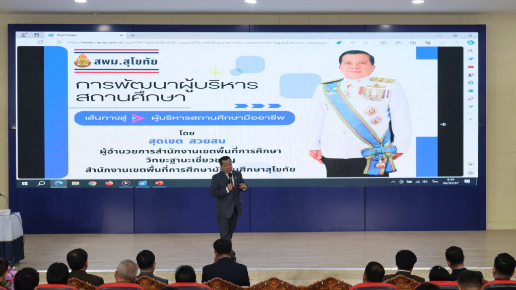 สำนักงานเขตพื้นที่การศึกษามัธยมศึกษาสุโขทัย จัดอบรมเชิงปฏิบัติการพัฒนาศักยภาพผู้บริหารสถานศึกษา ตำแหน่งรองผู้อำนวยการสถานศึกษา สังกัดสำนักงานเขตพื้นที่การศึกษามัธยมศึกษาสุโขทัย เพื่อเสริมสร้างและพัฒนาศักยภาพ ในการปฏิบัติหน้ที่ของผู้บริหารสถานศึกษาให้มีประสิทธิภาพและประสิทธิผล โดยมีนายสุดเขต สวยสม ผู้อำนวยการสำนักงานเขตพื้นที่การศึกษามัธยมศึกษาสุโขทัย เป็นประธาน และได้รับเกียรติจาก ดร.บัญชร จันทร์ดา อดีตผู้อำนวยการเชี่ยวชาญโรงเรียนอุตรดิตถ์ นายอรุณ หอมชื่น อดีตรองผู้อำนวยการชำนาญการพิเศษโรงเรียนเมืองเชลียง และผู้อำนวยการ สถานศึกษา ในสังกัดสำนักงานเขตพื้นที่การศึกษามัธยมศึกษาสุโขทัย มาเป็นวิทยากรให้ความรู้ ระหว่างวันที่ 6 – 7 มีนาคม 2567 ณ โรงเรียนอุดมดรุณี อ.เมือง จ.สุโขทัย (วันที่ 7 มีนาคม 2567)