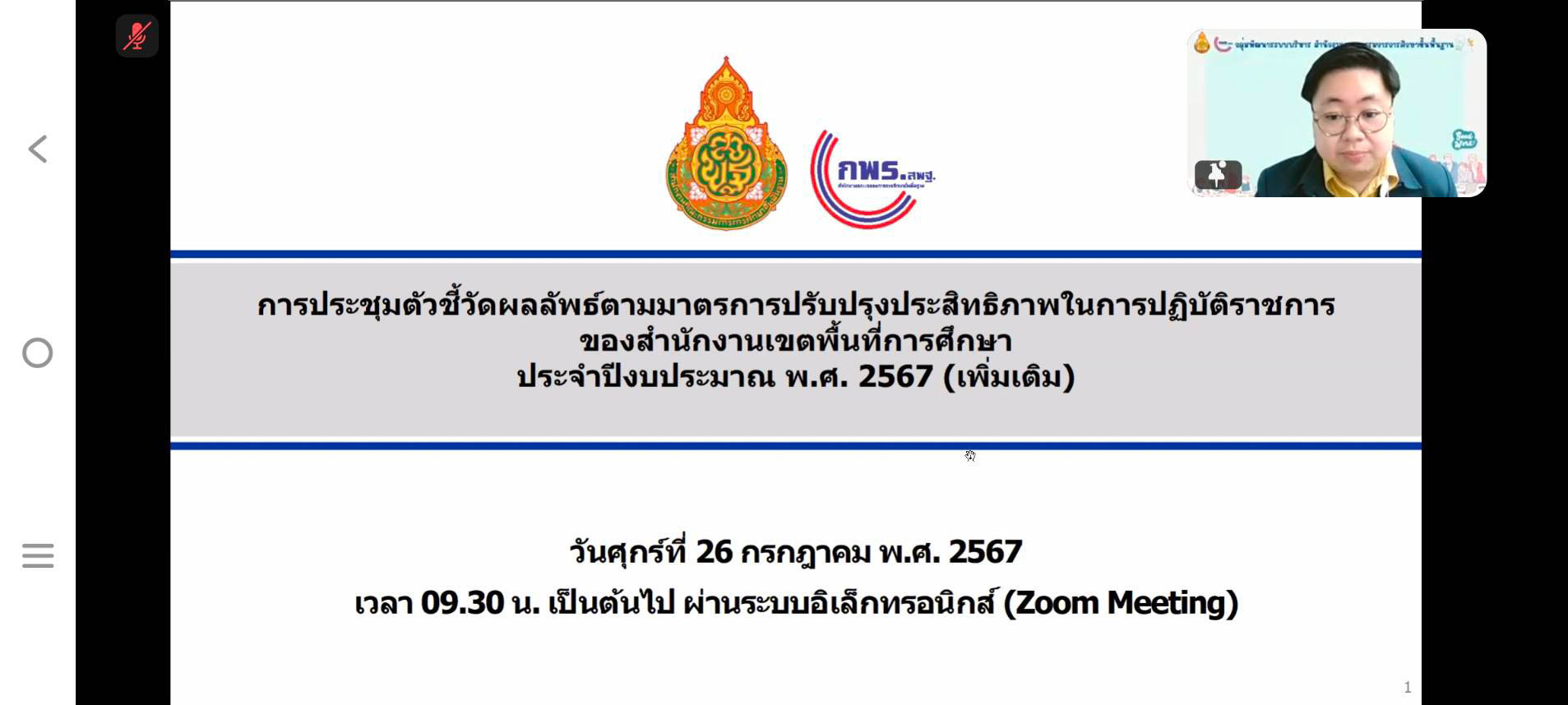 นายสุดเขต สวยสม ผู้อำนวยการสำนักงานเขตพื้นที่การศึกษามัธยมศึกษาสุโขทัย มอบหมายให้ นางสาวระย้า คงขาว ศึกษานิเทศชำนาญการพิเศษ นางสาวชลธิชา สุวรรณจันทร์รัศมี นักจัดการงานทั่วไป ปฏิบัติการ และนายสมพร ขุมเพชร์ เจ้าพนักงานธุรการชำนาญงาน เข้าร่วมประชุมชี้แจงตัวชี้วัดผลลัพธ์ตามมาตรการปรับปรุงประสิทธิภาพในการปฏิบัติราชการ ของสำนักงานเขตพื้นที่การศึกษา ประจำปีงบประมาณ พ.ศ. 2567 (เพิ่มเติม) เพื่อชี้แจงตัวชี้วัด 7.2D ผู้เรียนระดับชั้นประถมศึกษาปีที่ 3 – มัธยมศึกษาปีที่ 6 ที่ผ่านการคัดกรองด้วยระบบสำรวจแววความสามารถพิเศษด้วยระบบอิเล็กทรอนิกส์ พัฒนาศักยภาพตามพหุปัญญารายบุคคล และตัวชี้วัด 7.5B ร้อยละของสถานศึกษาที่ดำเนินการ ตามมาตรการป้องกันแก้ไขปัญหาฝุ่นละอองขนาดเล็ก (PM 2.5) ประชุมผ่านระบบอิเล็กทรอนิกส์ (Zoom Meeting) ณ สำนักงานเขตพื้นที่การศึกษามัธยมศึกษาสุโขทั (วันที่ 26 กรกฎาคม 2567)