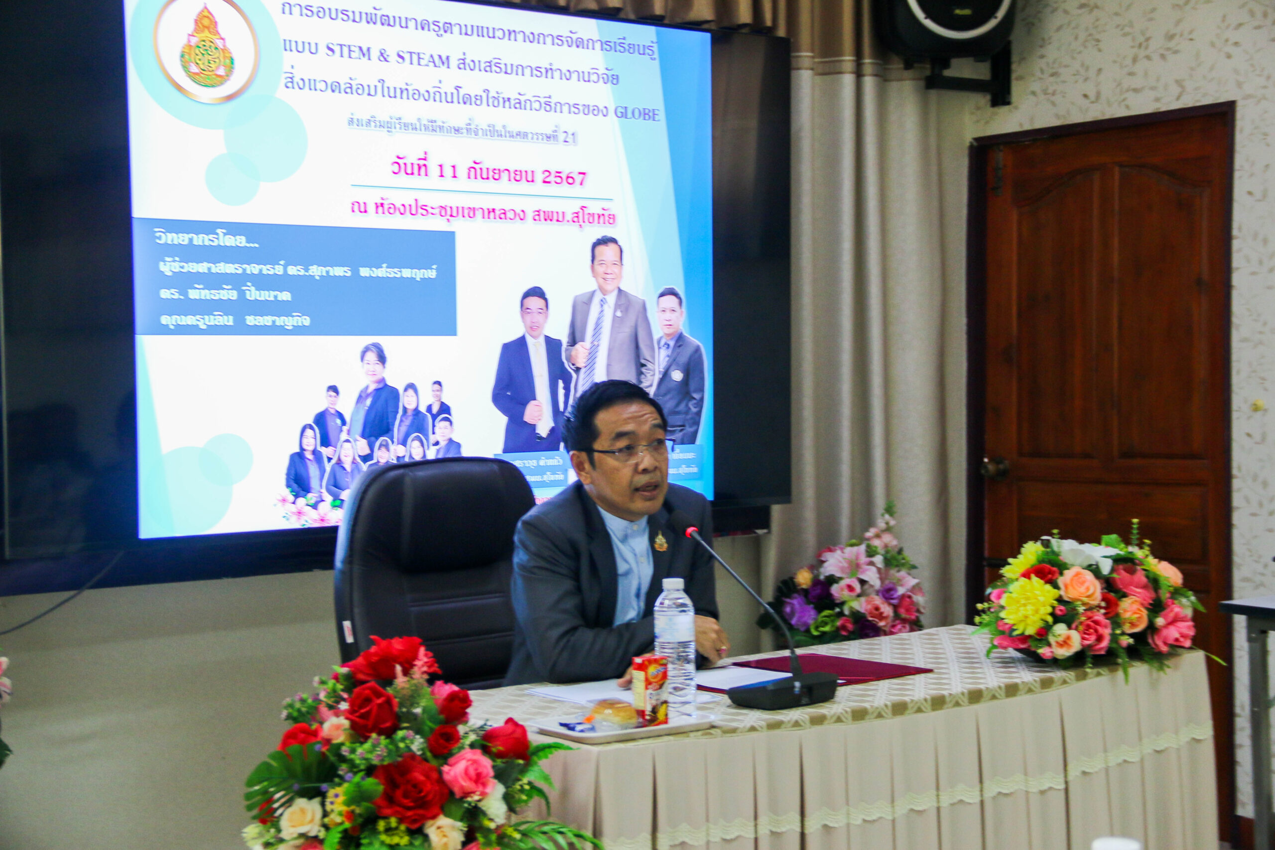 นายสุดเขต สวยสม ผู้อำนวยการสำนักงานเขตพื้นที่การศึกษามัธยมศึกษาสุโขทัย มอบหมายให้ นายศราวุธ คำแก้ว รองผู้อำนวยการสำนักงานเขตพื้นที่การศึกษามัธยมศึกษาสุโขทัย เป็นประธาน การอบรมพัฒนาครูตามแนวทางการจัดการเรียนรู้แบบ STEM & STEAM ส่งเสริมการทำงานวิจัย สิ่งแวดล้อมในท้องถิ่นโดยใช้หลักวิธีการของ GLOBE ส่งเสริมผู้เรียน ให้มีทักษะที่จำเป็นในศควรรษที่ 21 ผู้เข้าอบรมเป็นครูผู้สอน จำนวน 27 คน วิทยากรโดย ผศ.ดร.สุภาพร พงศ์ธรพฤกษ์ และดร.พีทธชัย ปิ่นนาค จัดโดยกลุ่มนิเทศ ติดตาม และประเมินผลฯ ณ ห้องประชุมเขาหลวง สำนักงานเขตพื้นที่ การศึกษามัธยมศึกษาสุโขทัย (วันที่ 11 กันยายน 2567)