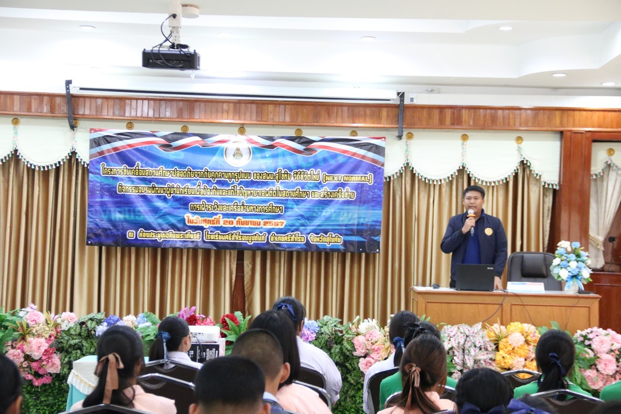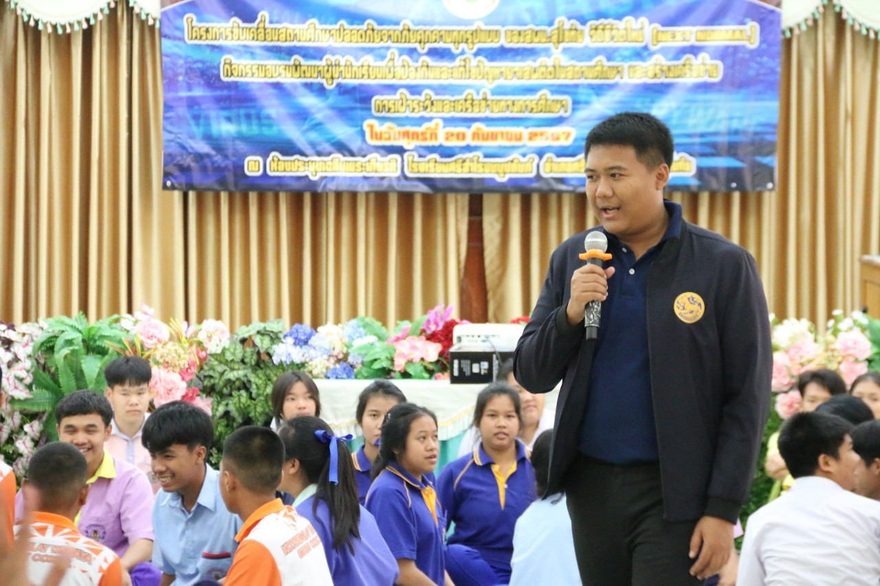 นายสุดเขต สวยสม ผู้อำนวยการสำนักงานเขตพื้นที่การศึกษามัธยมศึกษาสุโขทัย มอบหมายให้ นายศราวุธ คำแก้ว รองผู้อำนวยการสำนักงานเขตพื้นที่การศึกษามัธยมศึกษาสุโขทัย เป็นประธานอบรมพัฒนาผู้นำนักเรียน เพื่อป้องกันและแก้ไขปัญหายาเสพติดในสถานศึกษา และสร้างเครือข่ายการเฝ้าระวังและเครือข่ายทางการศึกษา นางสาวนิรวรรณ เลื่อนชิด นักวิชาการศึกษาชำนาญการ ปฏิบัติหน้าที่ผู้อำนวยการ กลุ่มส่งเสริมการจัดการศึกษา กล่าวรายงาน โดยมีคุณครูผู้รับผิดชอบงานด้านการป้องกันยาเสพติดหรือสถานศึกษาปลอดภัย จำนวน 27 คน และนักเรียนแกนนำระดับมัธยมศึกษาตอนปลาย จำนวน 81 คน เข้าร่วมอบรมฯ วิทยากรจาก ศอ.ปส.จ.สท. และทีมงาน เครือข่าย ผอ.กลุ่มกฏหมายและคดี สพม.สุโขทัย และวิทยากร กลุ่มส่งเสริมการจัดการศึกษา ณ ห้องประชุมเฉลิมพระเกียรติ โรงเรียนศรีสำโรงชนูปถัมภ์ อำเภอศรีสำโรง จังหวัดสุโขทัย (วันที่ 20 กันยายน 2567)