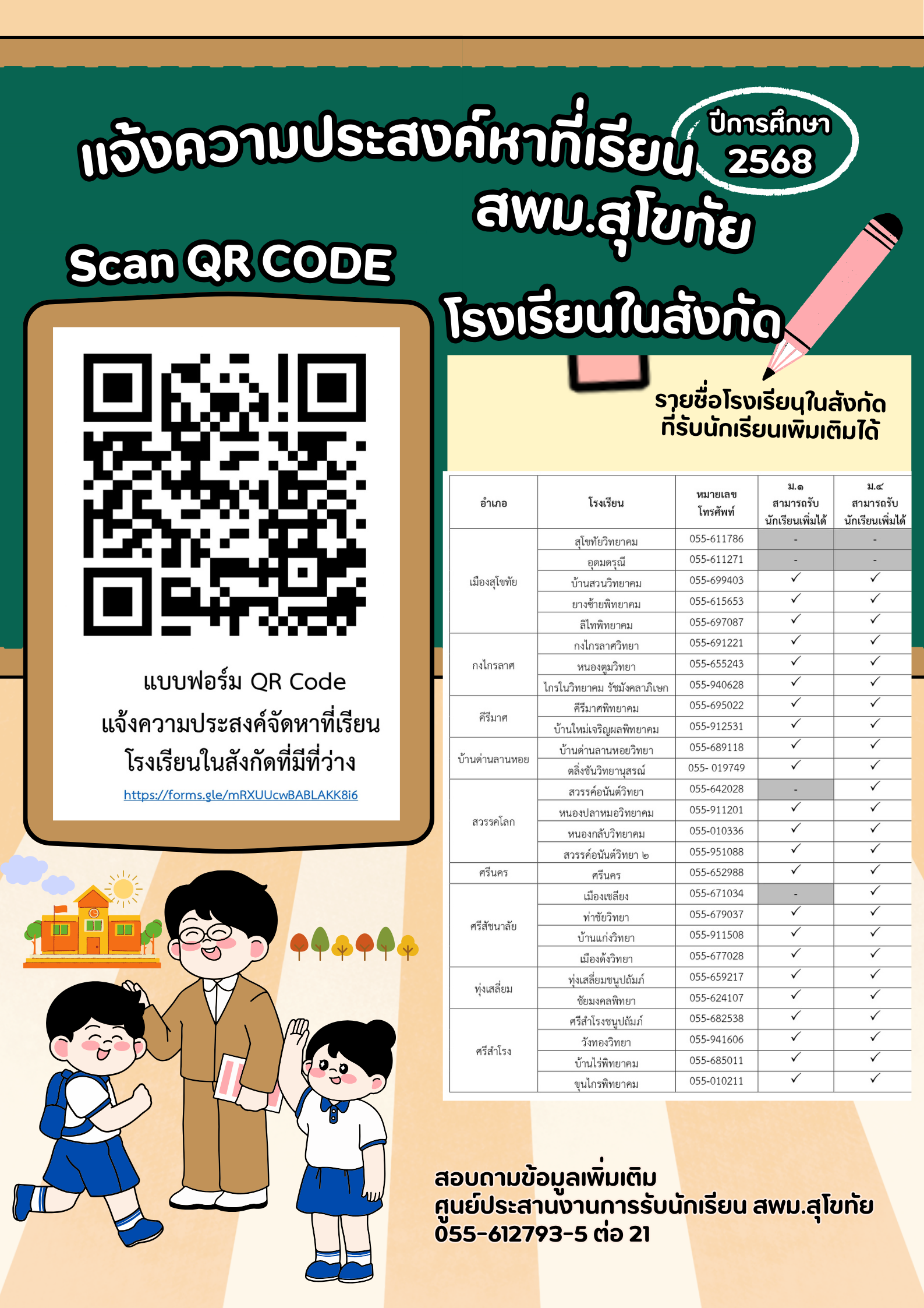 แจ้งความประสงค์หาที่เรียน สพม.สุโขทัย ปีการศึกษา 2568 10 เมษายน 256823 เมษายน 2025 admin ข่าวประชาสัมพันธ์ ผลการพิจารณาจัดหาที่เรียนให้นักเรียนชั้นมัธยมศึกษาปีที่ 1 และชั้นมัธยมศึกษาปีที่ 4 ปีการศึกษา 2568 เยี่ยมชม : 1,561 admin